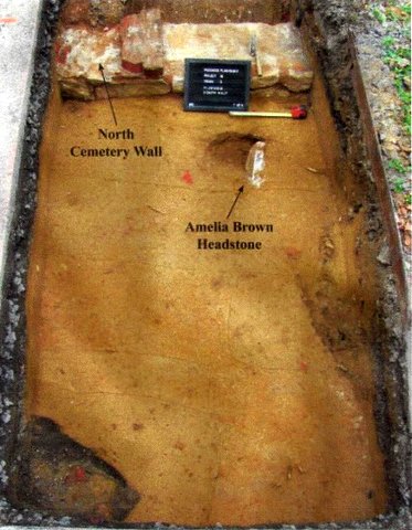 Photo of the north retaining wall of the BBG with the headstone of Amelia Brown protruding from the soil. This photo is in the archeological report page 3.17.