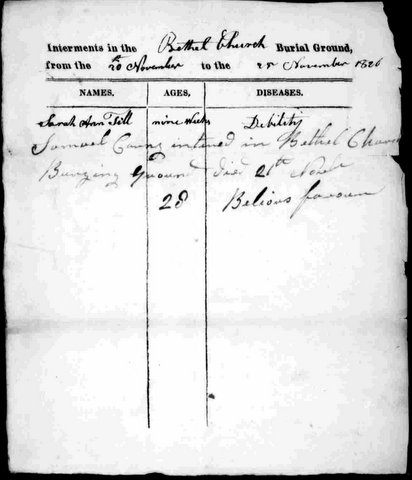 It was the duty of the church sexton of Bethel AME Church to dig the grave or have someone do it; supervisor the management of the Bethel Burying Ground and maintain the upkeep of the cemetery’s grounds. The sexton was also responsible for the official paperwork that went along with every burial. The law stated that no sexton was permitted to bury a body without a note (see above image) from an attending physician or a family member stating the deceased name, age, date of death and cause of death.