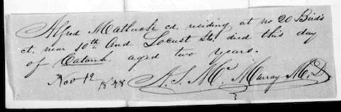 On November 10, 1847 the Philadelphia Board of Health ruled that BBG was a public nuisance following complaints by neighbors and an inspection by Board members. They issued the an order to the Church’s trustees: “You are hereby notified, that in all future interments made therein each body shall be deposited in the grave six feet in depth, and filled up with earth to a level with the proper surface of the ground; and that nobody shall be kept upon any part of the said grounds, or in any place appertinent and thereto, for a longer period than two hours previous to it being interred as above directed.” Philadelphia Board of Health Minutes for November 10, 1847.