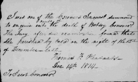 Betsy Conover, 30 years of age, died from exposure to freezing temperatures on December 12, 1814, and was buried at Bethel Burying Ground. Her cause of death was determined by a Coroner’s jury on December 14th.