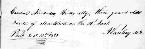 Three-year-old Caroline Alexander died this date, December 20th, in 1821 and was buried at Bethel Burying Ground. She lived with her family on Burd’s Alley* (now Alder Street) near 10th and Spruce Street. Her cause of death was Scarlatina or as we know it in modern times as Scarlet Fever. It is a disease that would often prove fatal until the invention of antibiotics. Without the drug, the bacteria would invade the kidneys and the heart with painful and devastating results. The victim of the disease was highly contagious. It would spread quickly and often kill scores in the same neighborhood.