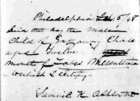 The one-year-old son of Sarah and Gazaway Chase* died on February 5, 1848 of Tabes Mesenterica and was buried at Bethel Burying Ground. The term “Tabes Mesenterica” was used up until the late 19th century to represent a group of illnesses in children that included malnutrition and swelling of the abdomen. Now that term is archaic and has been replaced by the term “tuberculosis of the mesenteric and retroperitoneal lymph nodes” or a type of cancer in the abdominal cavity.