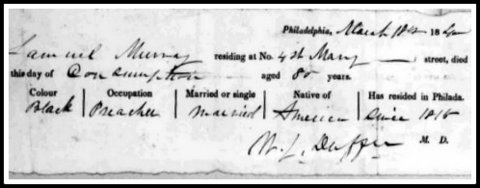 The Reverend Simon Murray died of Tuberculosis on this date, March 11th, in 1840 at the age of eighty years and was buried at Bethel Burying Ground. At the time of his death he lived with his spouse at #4 St. Mary’s Street in the Seventh Ward only a block away from “Big Wesley” in the middle of the 500 block of Lombard Street. He moved with his family to Philadelphia in 1818 at the age of 58 years of age. He was a used clothes seller and lay preacher who joined Richard Allen’s A.M.E. Bethel Church.