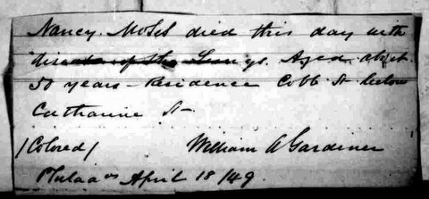 Nancy Moses, 50 years old, died this date, April 18th, in 1849 of “disease of the Lungs” and was buried at Bethel Burying Ground. Ms. Moses lived with her husband, Ezekiel, next to Bethel Burying Ground on Cobb Street (now Lawrence Street). She took in washing and ironing while Ezekiel earned a living working as a seaman for $20 per month according to the 1847 African American Census. The rent for their rooms was $90 a year. City directories reveal that as early as 1841 the family lived on the little alley street that abutted the graveyard. In addition to her spouse, Nancy also left behind two daughters Anna (18 y/o) and Mary (17 y/o).