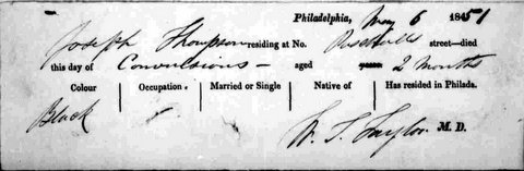 Two-month-old Joseph Thompson died this date, May 6th, in 1851 of convulsions and was buried at Bethel Burying Ground. The 1850 Federal Census, 1847 African American Census and the relevant city directories do not reveal any information on Joseph’s family. Educator, historian and author Charles L. Blockson claims that the African American neighborhood of Paschall’s Alley “aided and sheltered more fugitive slaves than any other section of the city until the Civil War.”*