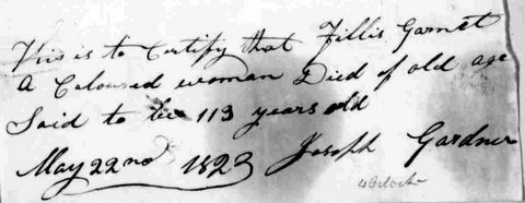 Fillis Garnet, 113 years of age, died this date, May 22nd, in 1823 and was buried at Bethel Burying Ground. It is stated that her cause of death was “old age.” Nothing more is known about Ms. Garnet. Although it can be assumed that she was of strong character and spirit.