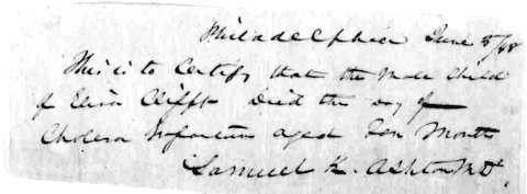The ten-month-old son of Elizabeth “Elisa” Clift* died this date, June 5th, in 1848 of Cholera and was buried at Bethel Burying Ground. Ms. Clift resided at 13 St. Mary’s Street and reported her occupation as a washerwoman in the 1847 African American Census. However, the social worker that interviewed Ms. Cliff for the Census intimates that Clift is a prostitute in a “bawdy house” with four other women. See http://fm12.swarthmore.edu/1847/full.php?rid=648&trc=4308
