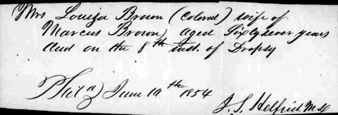 Marcus Brown died the same year as his wife according to Bishop Payne. I can find no official record of his death. I would presume that he would also be buried at Bethel Burying Ground next to Louisa.