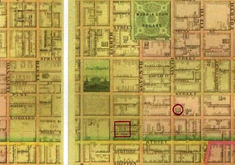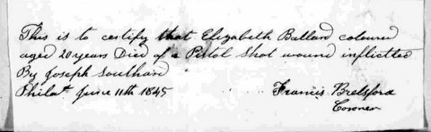 Elizabeth Ballard, 20 years old, was shot in the abdomen in the early evening of Friday June 6, 1845 and died at Pennsylvania Hospital on June 11th. She was buried at Bethel Burying Ground.