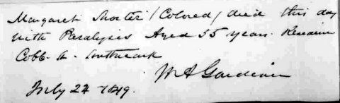 Margaret Shorter, 55 years of age, died this date, July 24th in 1849 after suffering a stroke. Sadly, little else is known about Ms. Shorter. She lived on Cobb Street which is across the street from Bethel Burying Ground. It is very likely she lived at #3 Cobb Street and was a live-in domestic for the African American Brister/Parker family. For further reading on this family, I suggest going to http://www.archives.upenn.edu/people/1800s/brister_james.html.