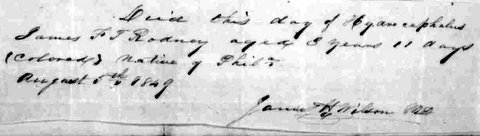 James F.T. Rodney, 3 years old, died this date, August 5th, in 1849 of Hydrocephalus* and was buried at Bethel Burying Ground. The child was the son of Ann Elizabeth Rodney, a single mother who had four other children in her care. The Rodney family lived in extreme poverty in a room in Madison’s Court which was in the rear of 7th and St. Mary’s Streets for which Ms. Rodney paid $2.50 a month. The neighborhood was one of the worst in the city but was affordable for a woman who took in washing for a living while raising 5 children. All the children attended school. It appears that James, before his death was enrolled in the Lombard Infant School. Their home was only two blocks from Bethel Church at 6th and Lombard where the family attended services. (1847 African American Census)