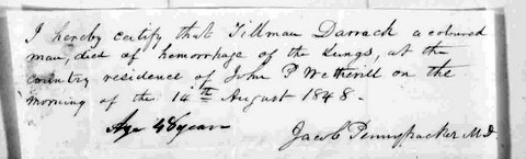 Tilman* Darrach, 48 years old, died this date, August 14th, in 1848 due to “Hemorrhage of the Lungs” and was buried at Bethel Burying Ground. I could find no other information on Mr. Darrach. Interestingly, he died at the country home of wealthy Quaker industrialist John P. Wetherill near Phoenixville in Delaware County, Pennsylvania. The Wetherill home in the city was on 13th Street between Cherry and Arch Streets. It may be that Mr. Darrach was employed by the Wetherills and suffering from a terminal illness was allowed to spend his last days outside the polluted city. Hopefully, further research will uncover more details.