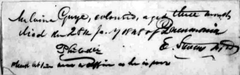 The physician who signed the death certificate is asking the Bethel Church sexton to please provide, free of charge, a coffin to bury little Melvina as the family is poor and cannot afford one.