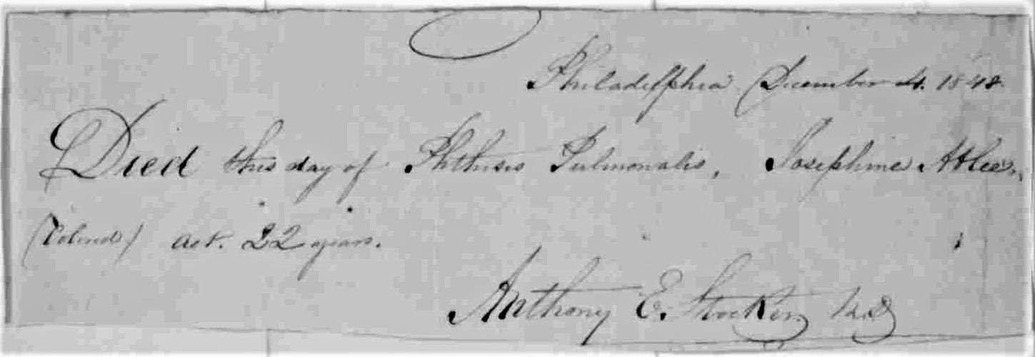 Twenty-two-year-old Josephine Atlee died this date, December 4th, in 1848 of Tuberculosis and was buried at Bethel Burying Ground. It appears from census records that she was the daughter of Adam and Lucinda Atlee and the sister of John and Hannah Atlee. At the time of Josephine’s death, Adam was ~56 years old, Lucinda ~55, John ~22, who may have been a twin of Josephine. Hannah was approximately 17 years old. All family members were born in Pennsylvania, according to the 1847 Philadelphia African American Census and the 1850 U.S. Census. (1)