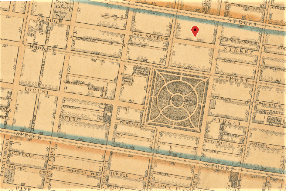 The Atlee family lived in a room in the 1800 block of George Street, now Samson Street (red pin). The residence was a half a block north of Rittenhouse Square. It was one of the original squares planned by William Penn in the 17th century. The Atlee family lived in one or two rooms for which they paid $3 a month which equates to $100 in modern currency. They reported $50 in personal property, which equates to approximately $1,600 in modern currency.