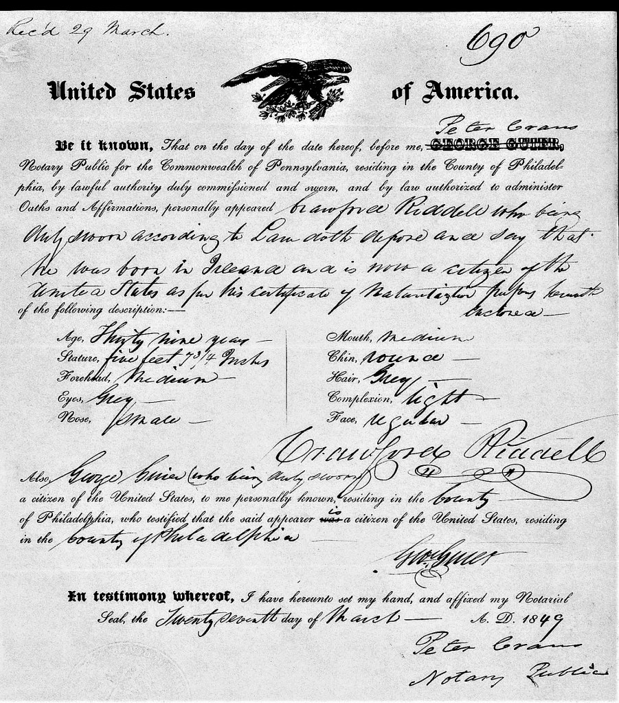 (1) Crawford Riddell filled out a passport application in 1849 and spelled his name “Riddell.” He needed the passport to travel to the Caribbean to presumably purchase quality hardwoods for his furniture company. On his return trip he contracted Cholera and died aboard the steamship Falcon. He was buried at sea in September of 1850 off the coast of Cuba.