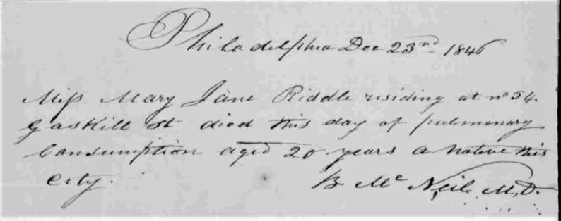 Twenty-year-old Mary Jane Riddell, a white woman, died this date December 23rd in 1846 of Tuberculosis and was buried at Bethel Burying Ground. Not married, Ms. Riddell (1) was born in Philadelphia. During my numerous years of research on those buried at Bethel Burying Ground I have found only one other white person buried at the cemetery. She is Diana Potts who was married to a Black man, therefore her interment can be easily understood.