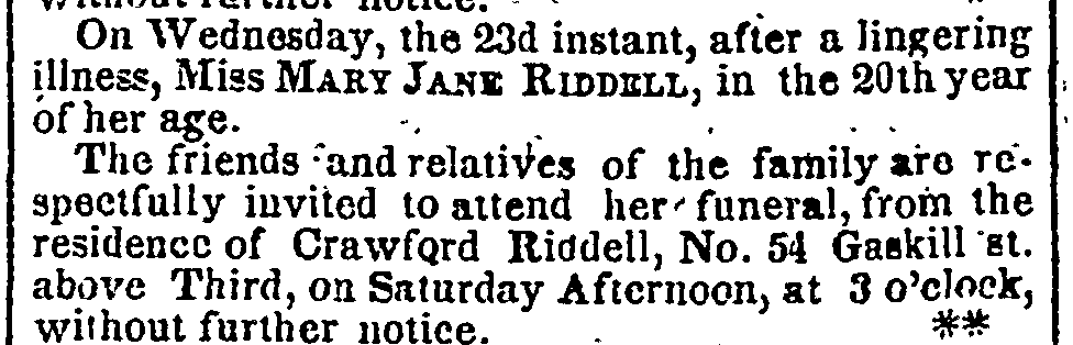 Ms. Riddell lived with her family at #54 Gaskill Street. The head of the household was Crawford Riddell a prominent furniture maker who was born in Ireland. Currently his works are prized by collectors and museums around the world. Also living at the Gaskill address was Crawford’s brother Christopher who was a cabinet maker according to the 1846 City Directory.