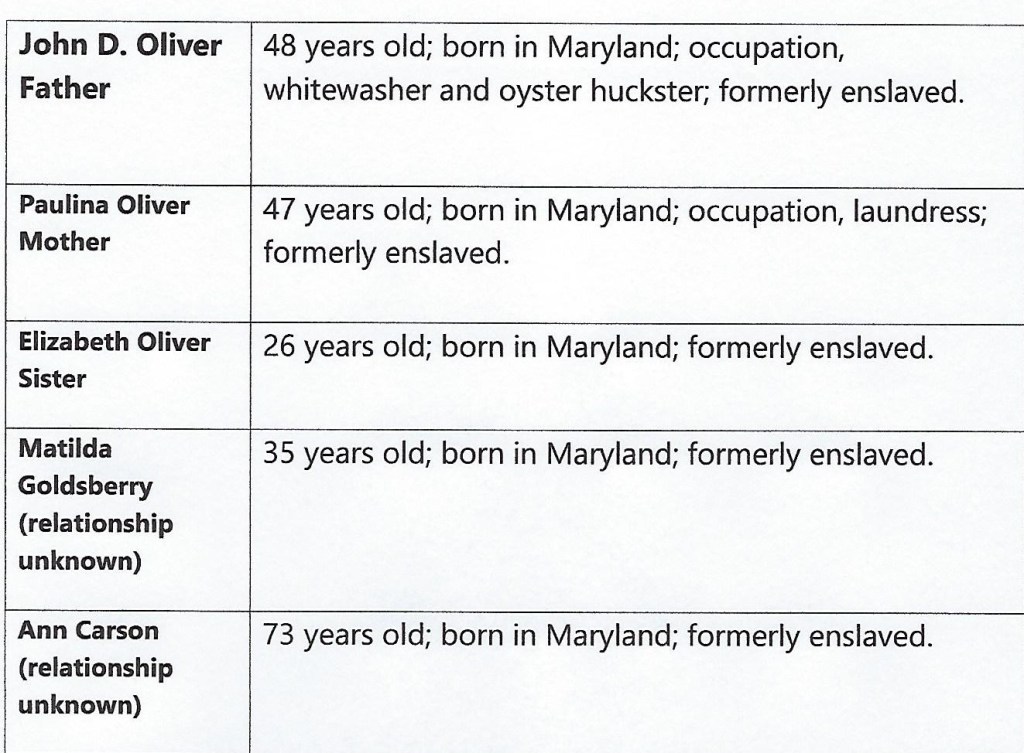 Living on Eutaw Street, in addition to the Oliver family, were thirteen other Black families with a total of sixty-four men, women, and children. The men worked as coachmen, teachers, seamen, and porters. The women were employed as cake bakers, domestics, and laundresses.