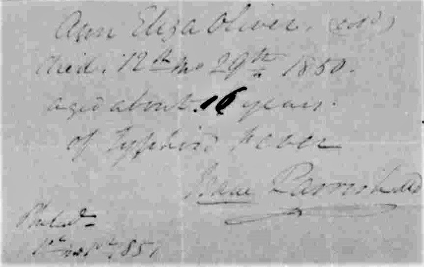 Ms. Oliver’s fatal illness, Typhoid, was caused by a Salmonella bacteria she consumed in contaminated food or water. She would have suffered a high fever, fatigue, headache, nausea, abdominal pain, and diarrhea. After approximately a month of suffering, the intestines perforate and septicemia take the victim’s life. Ann Eliza was one of 107 Philadelphians to die of Typhoid in 1850, according to Board of Health records.