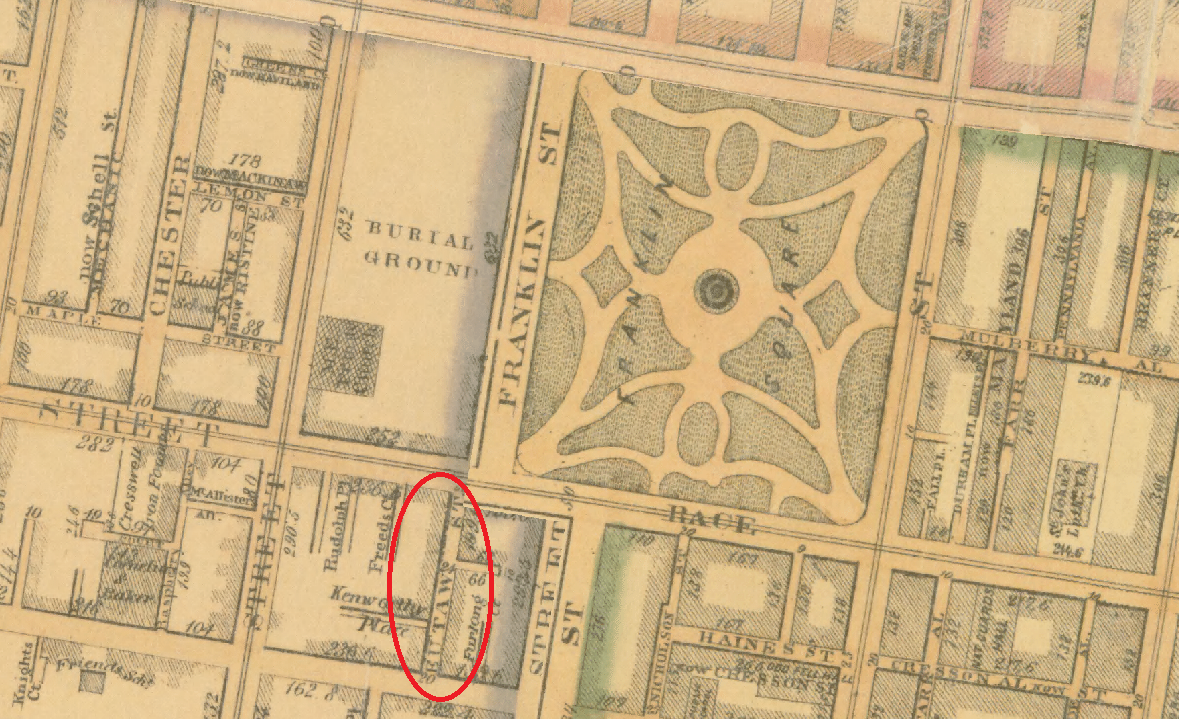 The Oliver family lived on Eutaw Street near Franklin Square. Originally named North East Publick Square by William Penn, it was renamed in 1812 to honor Benjamin Franklin. It currently is located in the Center City area, between North 6th and 7th Streets, and between Race Street and the Vine Street Expressway. Eutaw Street no longer exists.