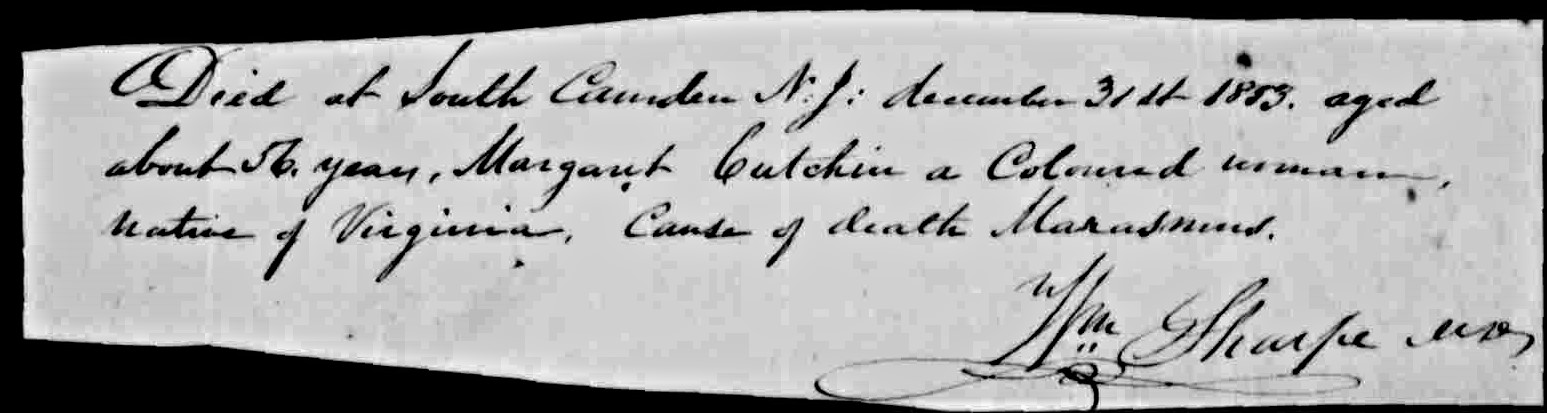 Mr. and Ms. Cutchins obviously were active in the abolition movement and cared for newly liberated Black men, women and children in their home. It is very likely the Cutchins residence was a stop on the Underground Railroad, helping those being tracked by fugitive slave catchers. Ms. Cutchins may have been on an Underground-related trip to Camden when she suddenly died. Surely an unsung heroine!