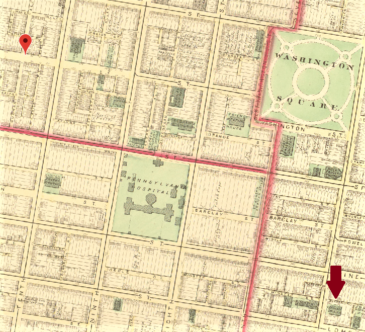 Mary and Dennis Bacon lived in a room at #2 Eagle Court located near the intersection of 10th and Locust Streets, illustrated by the red pin on the above map. The red arrow indicates the location and proximity of Bethel African Methodist Episcopal Church at 6th and Lombard Streets. In 1847 Eagle Court was a small, dead end alley. It was home to thirty-seven Black families with a total of one hundred thirty four men, women, and children. The women were employed as dressmakers, laundresses, and domestic workers. The men were employed as waiters, porters, and white washers (painters). These quarters were perfectly designed to spread deadly diseases, such as tuberculosis and small pox.