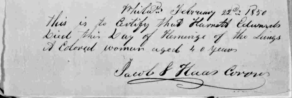 The 1847 Philadelphia African American Census reports that either Harriet or Daniel Edwards was formerly enslaved. It did not indicate which one. Both were born in Maryland. Ms. Edwards was self-employed as a laundress which was very strenuous work and dangerous to someone who had a serious illness. Mr. Edwards received $23 a month or $770 a month in modern currency as a “seaman.” The couple paid $3.50 a month or approximately $118.00 in modern currency for a room on Union Street. They belonged to a beneficial society that likely helped with the burial expenses.