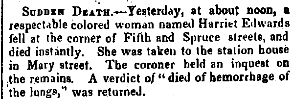 Ms. Edwards collapsed at the corner of 5th and Spruce Streets in center city. The location was a block away from her home on Union Street. Her body was transported to the coroner’s office. Her husband Daniel was employed as a seaman and may not have been in the city. There is no record of the couple having children.