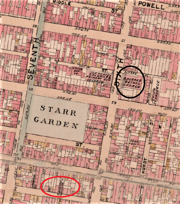 The red circle above shows the heart of the “negro quarters” on Bedford Street. The black circle illustrates the location and proximity of Bethel African Methodist Episcopal Church.
