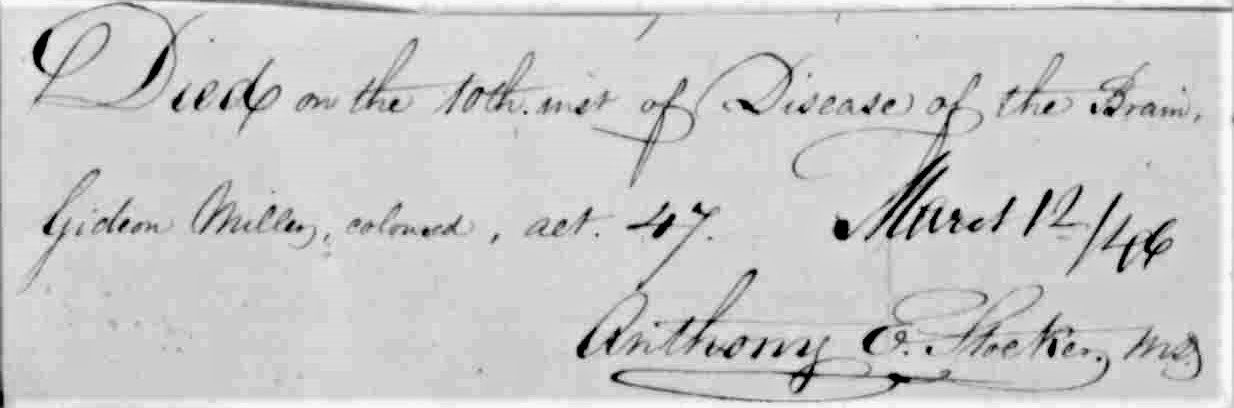 Forty-seven-year-old Gideon Miller died this date, March 10th, in 1846 of a non-specific brain disease and was buried at Bethel Burying Ground. At the time of his death, he was too ill to be employed, according to the 1847 Philadelphia African American Census. He had formerly worked as a waiter. His spouse, Mary Miller, was thirty-four years old and was self-employed as a laundress. Both were born enslaved in Maryland, according to the 1840 and 1850 U.S. Censuses. Mr. Miller’s death left Mary Miller the sole caretaker of her five children.