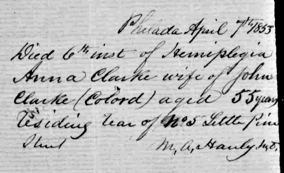 Fifty-five-year-old Anna Clarke died this date, April 6th in 1853 of “Hemiplegia.” This would be paralysis of one side of the body from a stroke or head injury. Six years earlier in the 1848 Philadelphia African American Census, Ms. Clarke reported she was self-employed as a laundress. It was a strenuous job, even for a young person. John, her husband, worked as a stevedore, loading and unloading cargo from the ships docked on the Delaware River wharfs. It too was a backbreaking job, even for someone half his age. We don’t know his exact age but we can assume it was close to his spouse’s age. In 1847, there was another female in the home listed in the census as someone between the ages of 14 and 50 who also worked as a laundress. Her relationship to the Clarkes’ was not recorded. Only two of the three residents were born in Pennsylvania. In 1847, the family lived in Rose Alley.