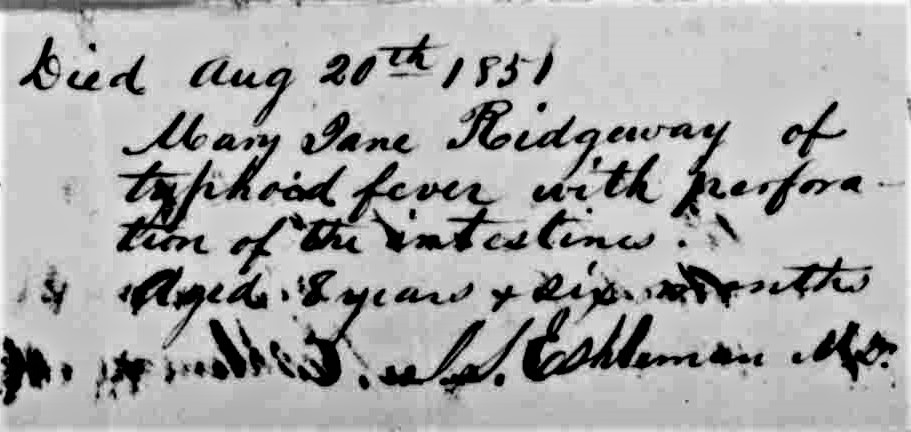 Eight-year-old Mary Jane Ridgeway died this date, August 20th, in 1851 of “typhoid fever with perforation of the intestines” and was buried at Bethel Burying Ground. Typhoid on its own may not have led to her death, however, perforation and subsequent abdominal bleeding cause a deadly bloodstream infection (sepsis). Mary Jane would have suffered terribly from nausea, vomiting blood, and severe abdominal pain.