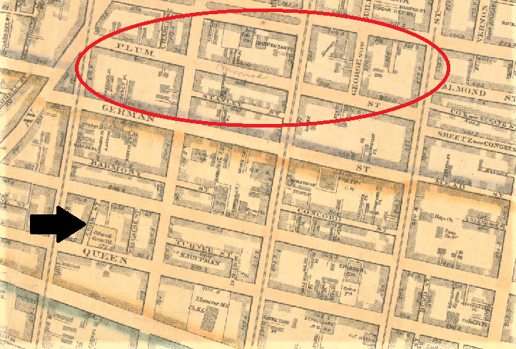 Plum Street was described by a journalist of the era as a “small dark alley”and “long known as the most concentrated street of white prostitution in the city” and “a center of low-life in the city.” (1) The center of this mayhem was Dandy Hall. In a large three-story house at the eastern end of Plum Street, there was a saloon, a dance hall, and a brothel in one structure. On any given night, the drunken chaos from the building spilled out onto the street and created an extremely violent environment. That was never truer when on Christmas Eve in 1846 Dandy Hall came under attack by the “Home Squadron,” a group of hardcore murderers from the Killers gang. Blood ran in the street as throats were slashed and skulls crushed as constables tried to stop the destruction. (1)
