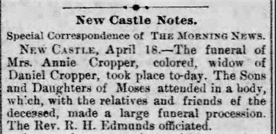 It appears that the family moved back to Delaware after the death of Joseph. Daniel Cropper died in December of 1886 and Annie Marie Cropper in 1889. (2)