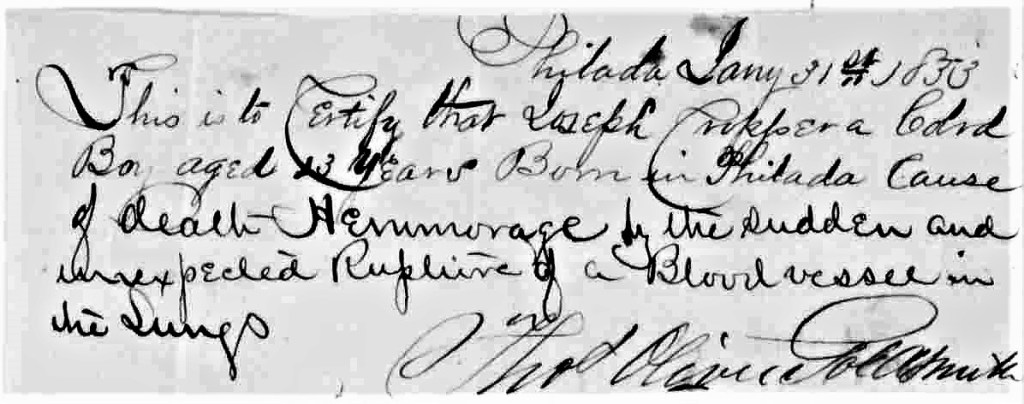 Thirteen-year-old Joseph Cropper died this date, January 31st, in 1853 of a “sudden and unexpected Rupture of a Blood vessel in the Lungs.”