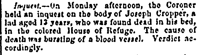 According to the 1850 U.S. Census, Joseph was the son of Daniel and Annie Maria Cropper. Mr. Cropper was forty years old at the time of his son’s death. Ms. Cropper was forty-two years old. Mr. Cropper was employed as a waiter and a porter, as the latter was usually seasonal.