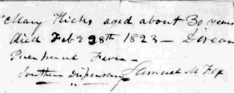 Thirty-years-old Mary Hicks died of Puerperal Fever or “childbed fever” on this date, February 28th, in 1823 and was buried at Bethel Burying Ground. The disease is a bacterial infection of the female reproductive tract following childbirth or miscarriage. It usually occurs after the first 24 hours and within the first ten days following delivery. From the 1600s through the mid to late 1800s, the majority of childbed fever cases were caused by the doctors themselves. With no knowledge of germ, doctors did not believe hand washing was needed. (See http://en.wikipedia.org/wiki/Puerperal_infections.)