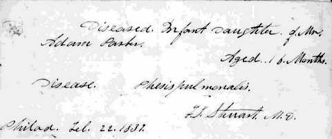 Ms. Hicks was seen by a doctor, Samuel M. Fox, from the Southern Dispensary. It was one of the three free clinics in Philadelphia created in the early 1800s by wealthy citizens (“subscribers”) to treat the poor. Young doctors would donate their services to gain clinical experience. They visited the sick in their homes and would treat fractures, burns and extract teeth. The sick that could walk went to the Dispensary office to be treated where free prescribed medicines were also available. Smallpox vaccinations were dispensed and serious illnesses were referred to Pennsylvania Hospital for surgery. Indigent pregnant women were given the options of entering the hospital or home delivery where the doctor and possibly a midwife would attend. It appears that Ms. Hicks chose the latter. In all probability, it was the Dr. Fox who infected her with the germs that killed her. (Priscilla Ferguson Clement, Welfare and the Poor in the Nineteenth-century City: Philadelphia, 1800-1854, 145-146.)