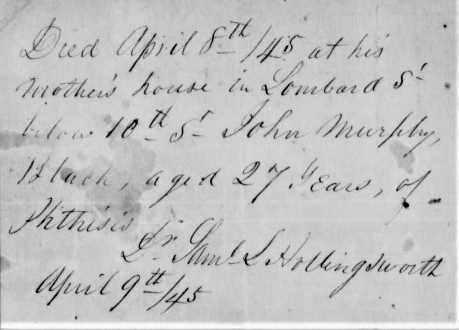 The beautiful penmenship of cemetery manager Shepherd Gibbs reveals that the father of the deceased child was Mr. Mark Davis. I can only find a reference to the family in the 1838 Philadelphia African American Census. Mr. Davis worked as a porter while Ms. Davis (not named) was self-employed as a laundress. Both were not born in Pennsylvania. In 1837, when the census was taken, they had a child who was old enough to attend Sunday school at Bethel A.M.E. Church.