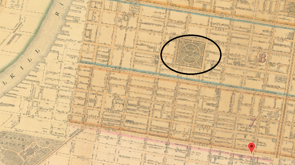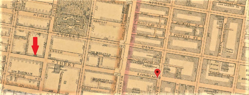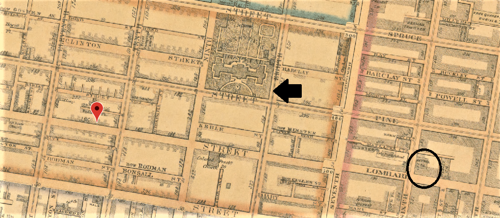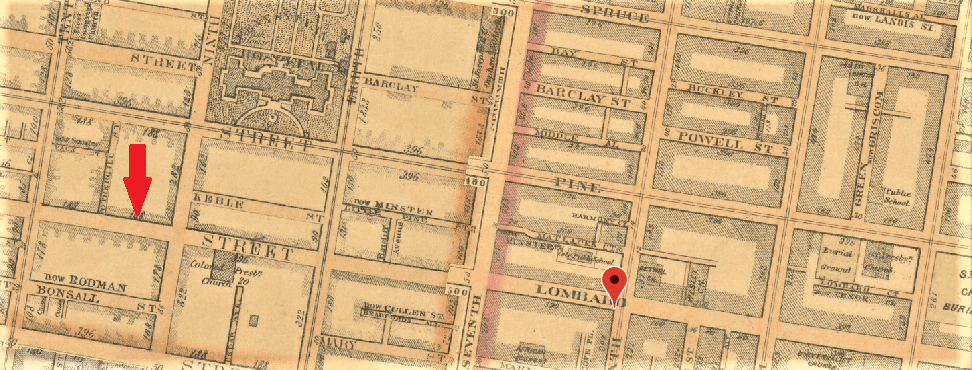 The red pin indicates the location of the Davis home on Lombard Street below 11th Street. The black circle illustrates the location and proximity of Bethel A.M.E. Church where the family attended religious services. The black arrow points to the location of Pennsylvania Hospital at 8th and Pine Sreets.