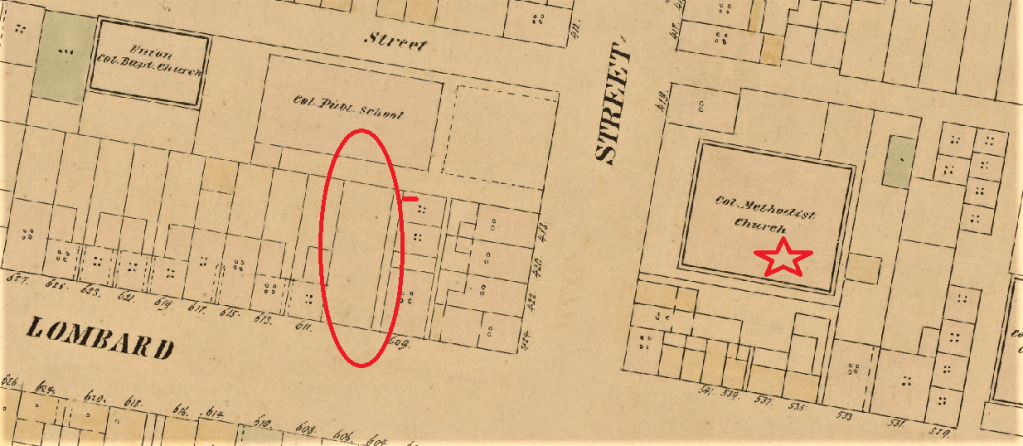 The 1838 Philadelphia African American Census shows twelve Black families living on Lombard Street between 10th and 11th Street. These families totaled thirty-eight men, women, and children. The women were self-employed as laundresses and seamstresses while the men were employed as porters and coachmen. The infants went to either the Shiloh Infant School or the 6th & Lombard Street School. The older children went to the Raspberry Alley School which was also open evenings for adult classes.