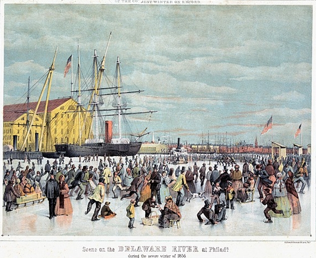 The above lithograph depicts the Delaware River in the winter of 1856. The sailing ships in the background are immobilized until the river is cleared of ice by warmer weather.